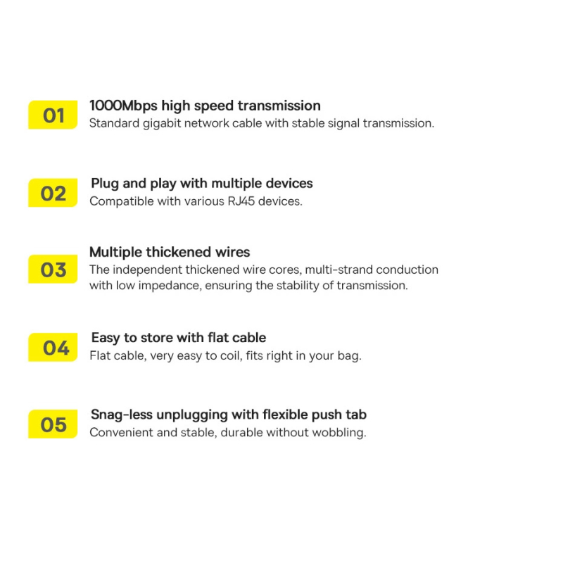 You can use Baseus patchcords to connect active and passive devices in LAN, Ethernet, industry, home and office networks. They undergo rigorous tests to meet the requirements of category 6. This ensures high transmission parameters and data transfer speed of 1 Gbps.