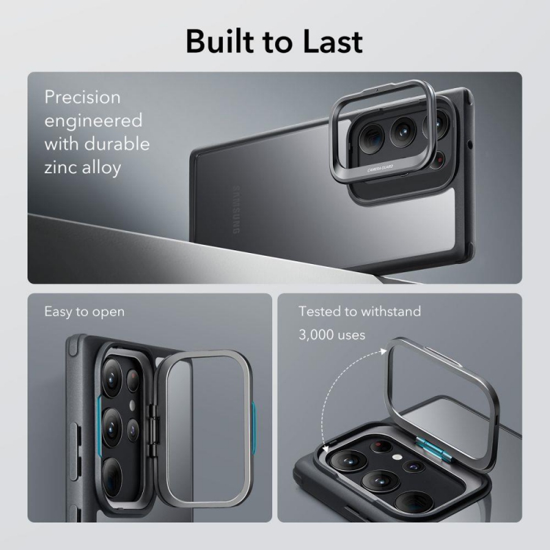 Kromě standardní, zvýšené krytky kolem čoček je pouzdro navíc vybaveno kovovým otevíratelným rámečkem, který lze snadno přeměnit ve funkční stojánek. Má kryty tlačítek a výřezy pro porty.