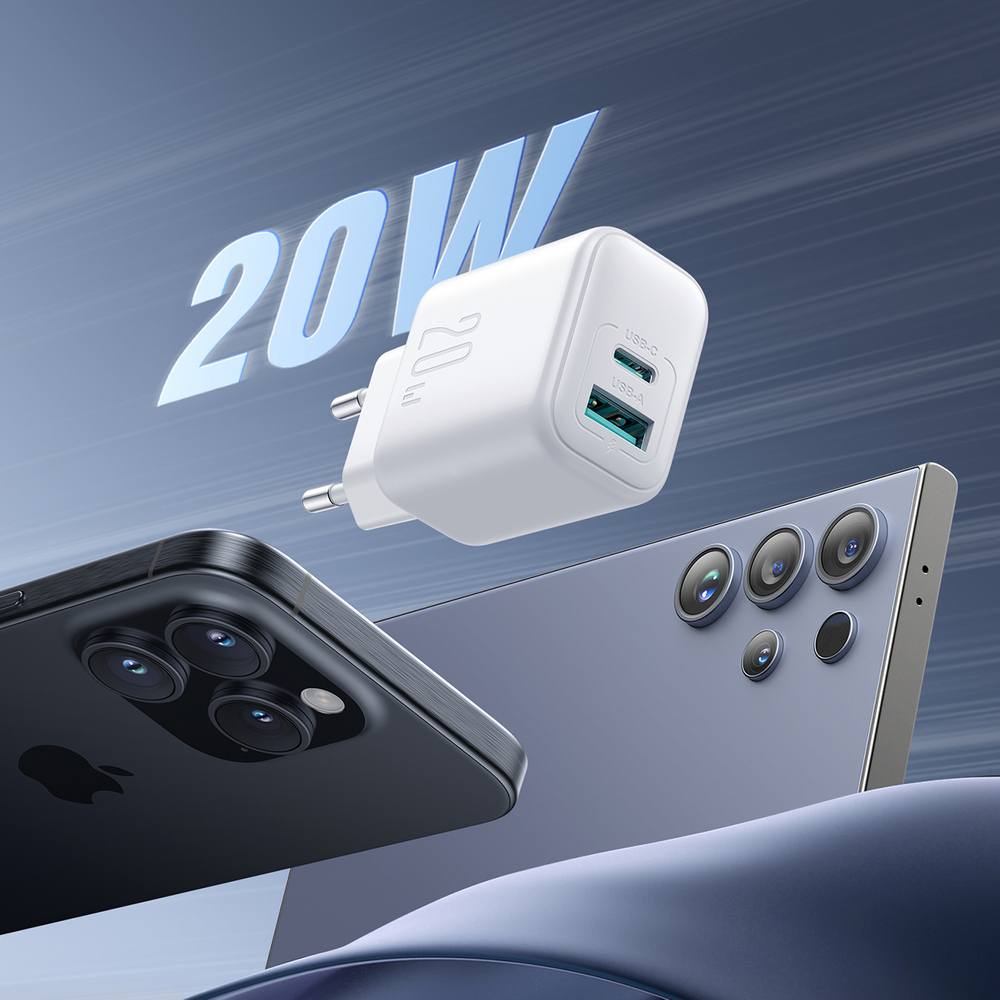 How to charge your devices quickly and effectively? Choose the Joyroom JR-TCF21 wall charger. Thanks to it, you can charge, for example, the latest iPhone up to 68% in just 30 minutes! This charger offers up to 4x faster charging for Samsung and iPhone, making it the perfect choice for anyone who owns these devices. Supports PD and QC 3.0 protocols, ensuring fast charging. With it, you can charge two devices at the same time using the USB-C and USB-A ports.