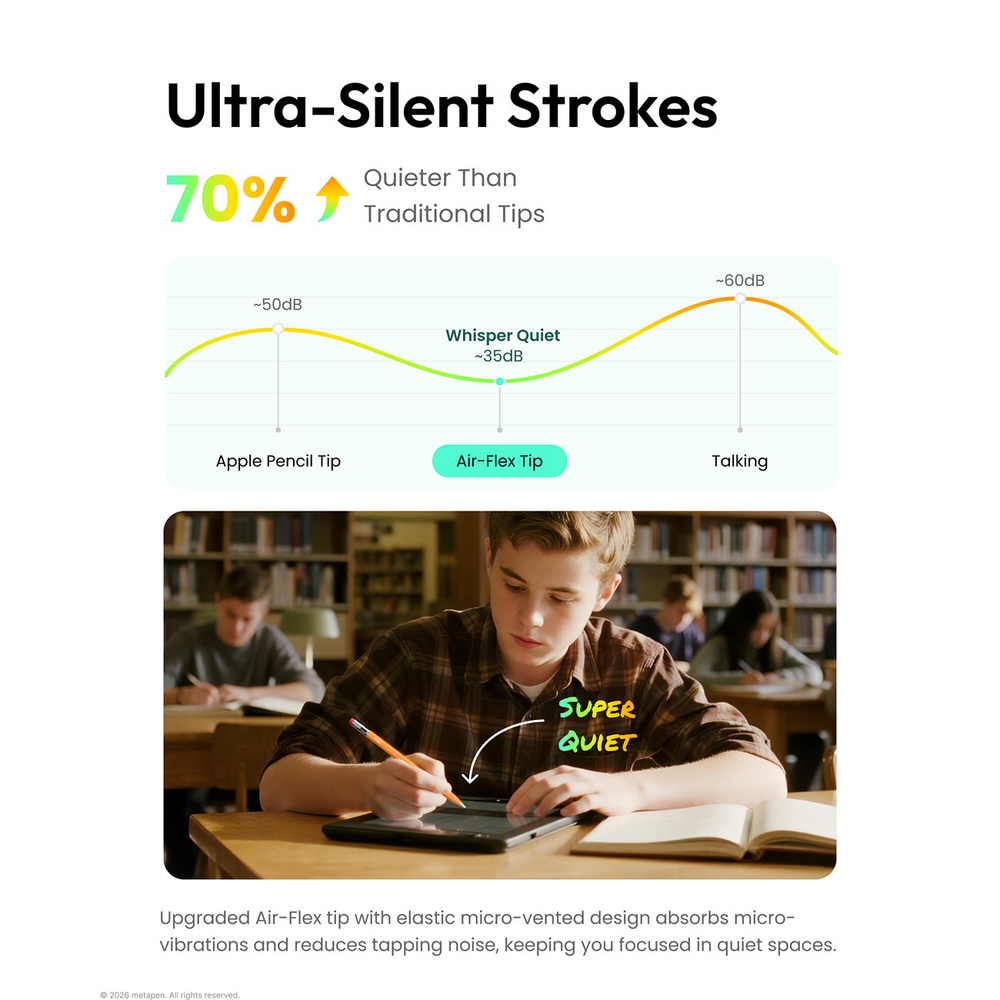 Metapen Air-Flex tips reduce friction noise by up to 70% compared to traditional tips. The absence of the characteristic clicking sound allows you to work comfortably in the library, office, or during classes without distractions.